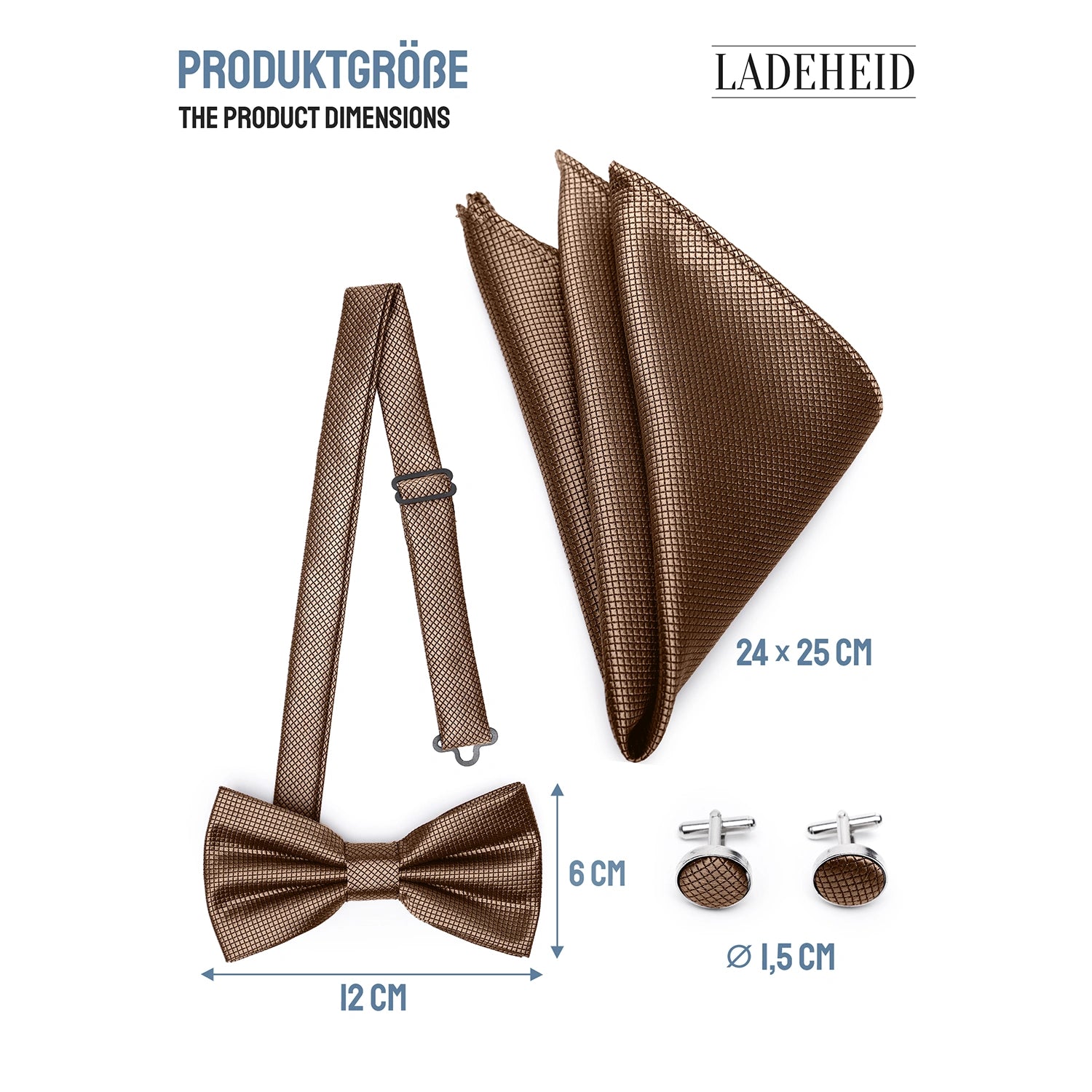 - Elegante Vielseitigkeit: Stilvolle Fliege und Manchettenknöpfe für raffinierte Looks. Zeitlos und passend für verschiedenste Anlässe – von Hochzeiten bis zu Geschäftstreffen.