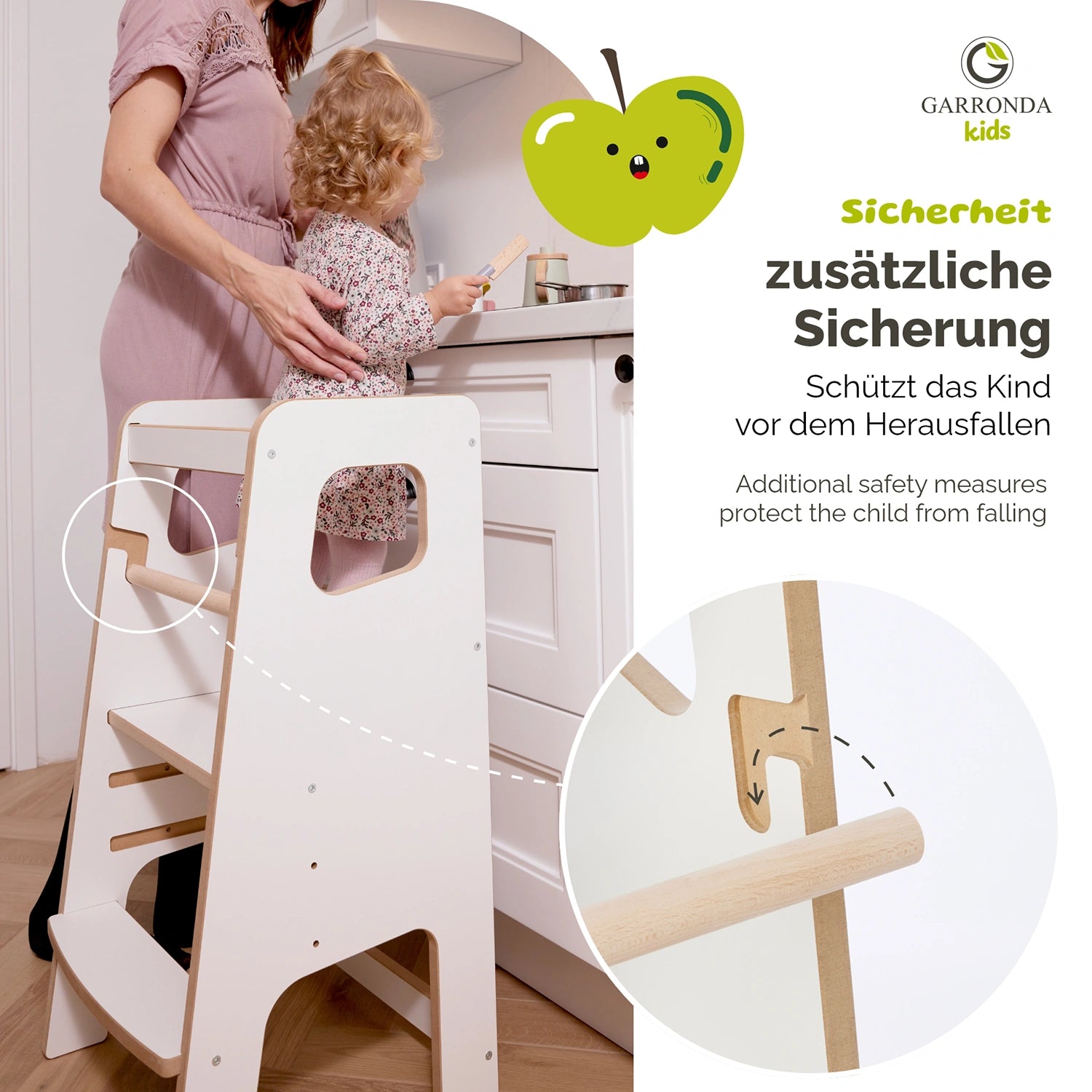 Der Garronda Kitchen Helper ist ein innovativer Küchenhelfer für Kinder ab einem Jahr, der die Funktionen eines Lernturns und eines Hockers vereint. Dadurch können Kleinkinder sicher an Küchenaktivitäten teilnehmen, ihre Motorik entwickeln und ihre Neugier fördern. Diese Holzkonstruktion dient auch älteren Kindern ab zwei Jahren als Hilfe, um höhere Oberflächen zu erreichen oder als hohen Stuhl bei gemeinsamen Mahlzeiten. Das multifunktionale Design von Garronda macht es zu einem unverzichtbaren Element jeder Küche, das die Entwicklung und Unabhängigkeit der Kinder bei täglichen Küchenaktivitäten unterstützt.