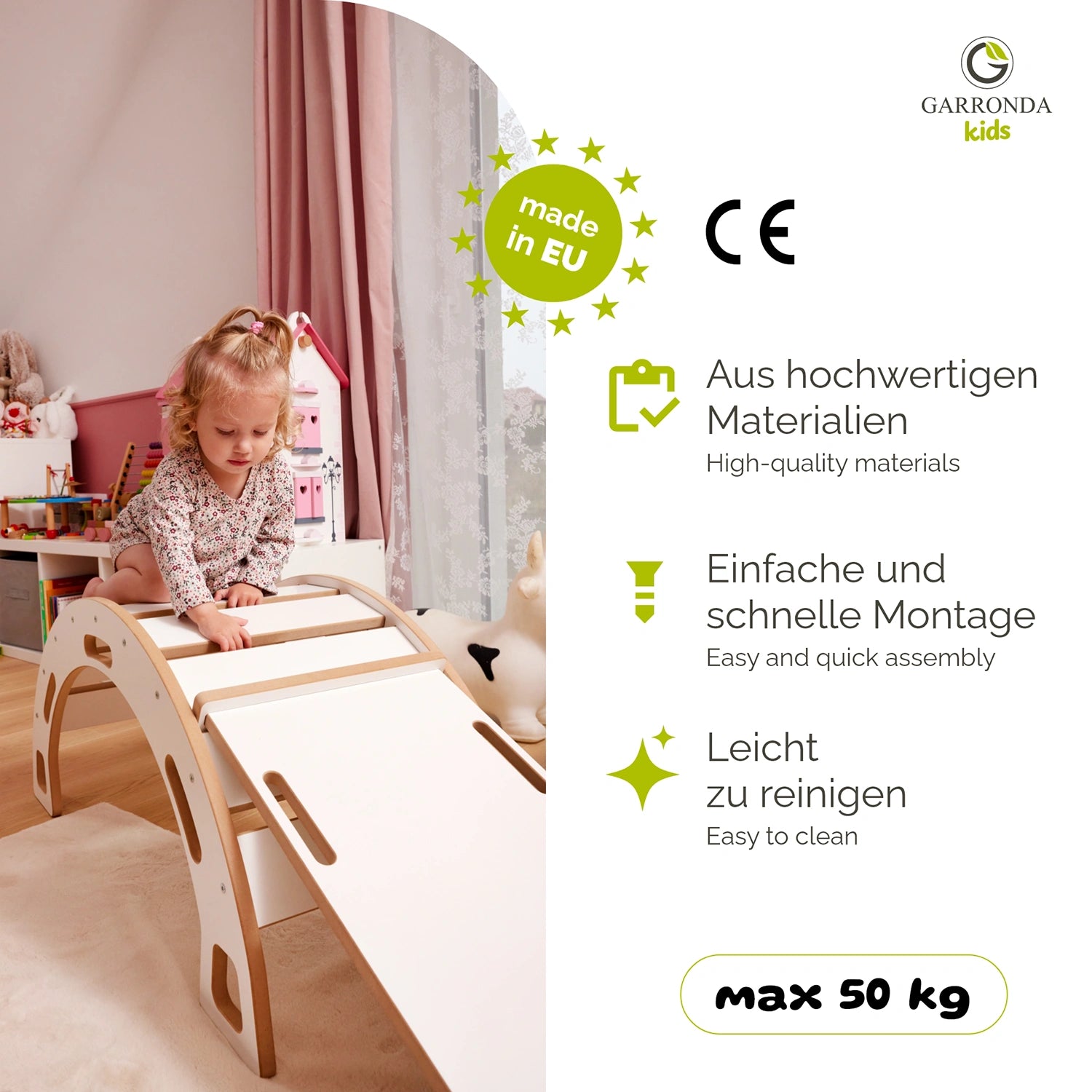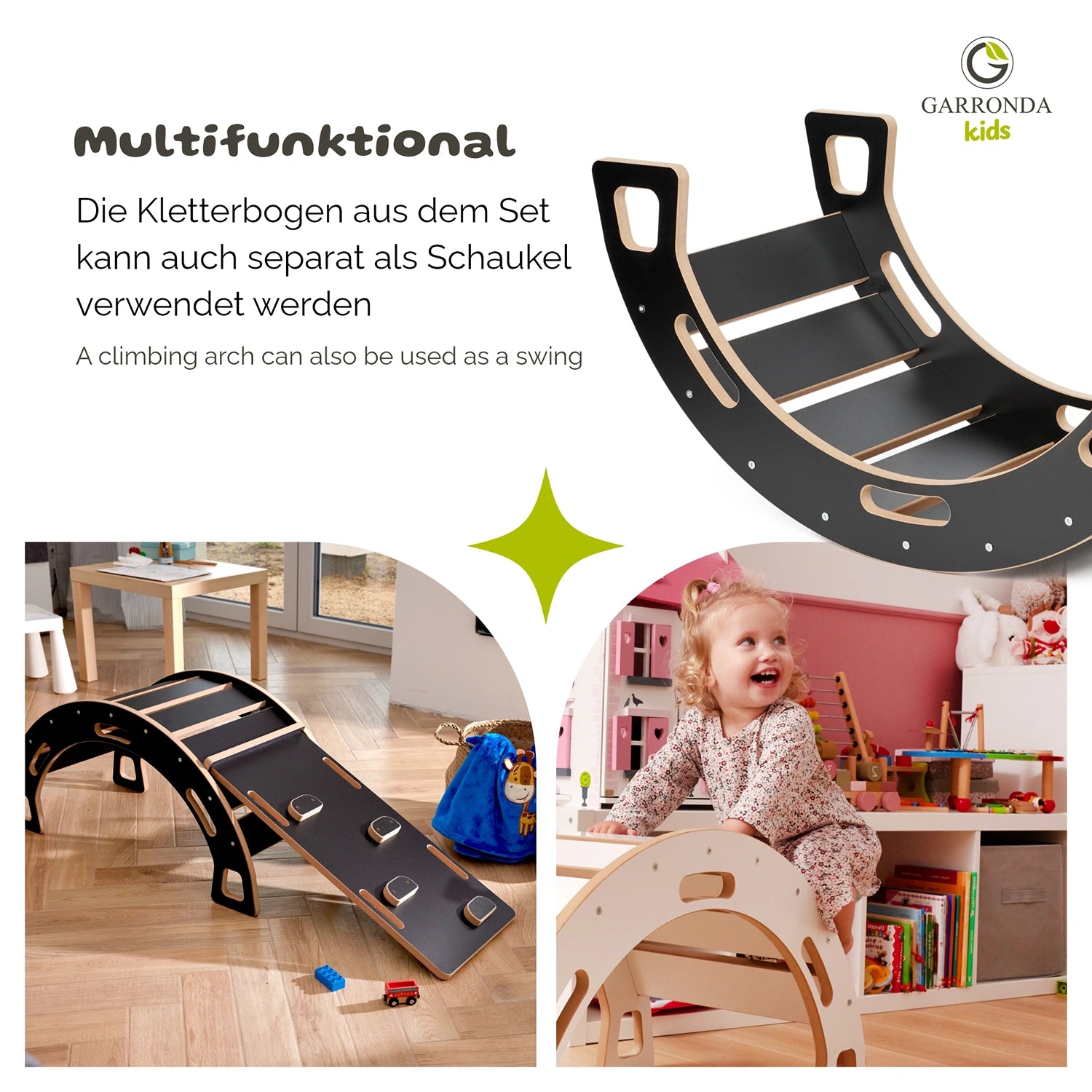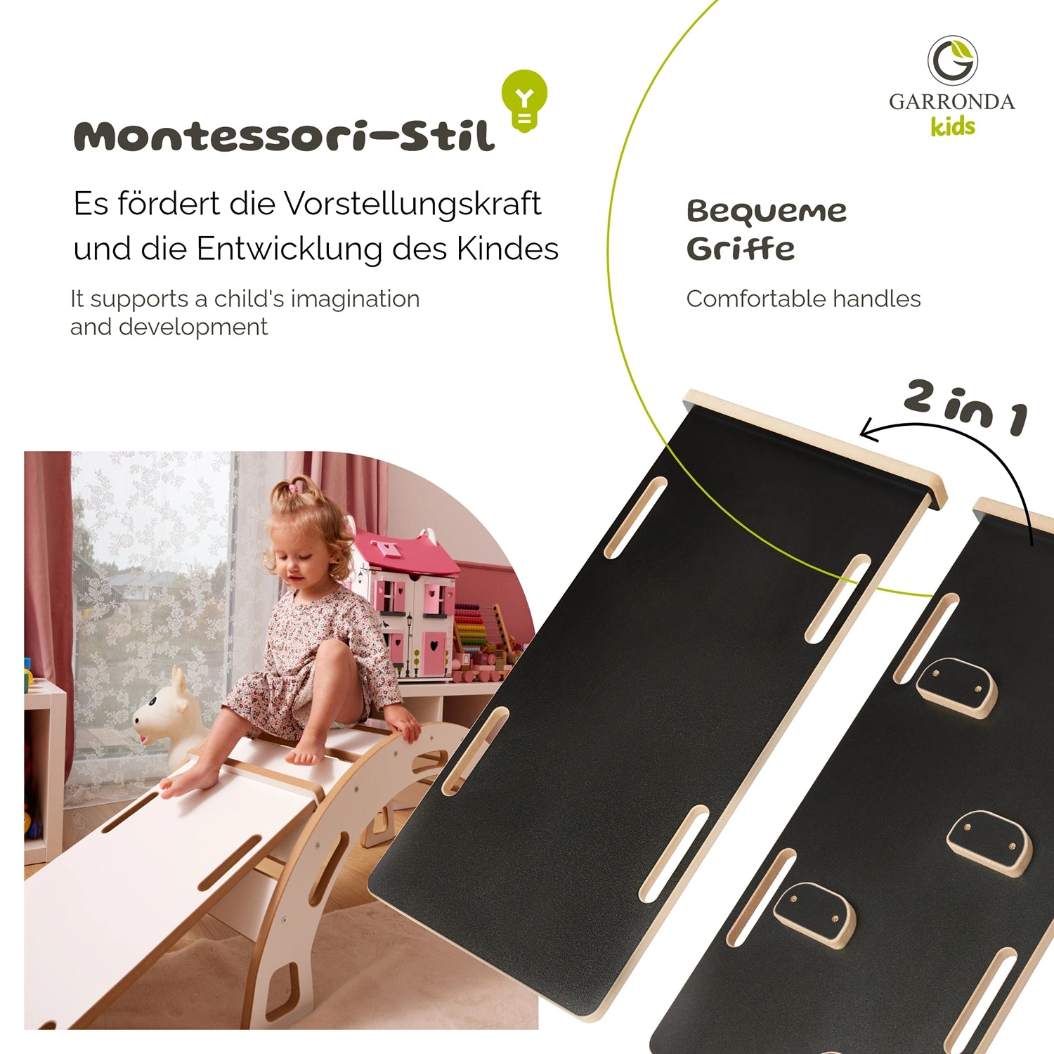 Der Garronda Montessori Kletterbogen mit Rutsche für Kinder ist eine Kombination aus Funktionalität und Spaß. Ab dem 1. Lebensjahr bietet es Kindern die Möglichkeit, Ihre motorischen Fähigkeiten beim Klettern zu entdecken, und kreativ zu entwickeln. Unterstützt von der Montessori-Idee wird es nicht nur zu einem praktischen Möbelstück im Kinderzimmer, sondern auch zu einem perfekten Geburtstags- oder Weihnachtsgeschenk. Es fördert die motorische Entwicklung der Kleinsten im Geiste der Montessori-Philosophie.